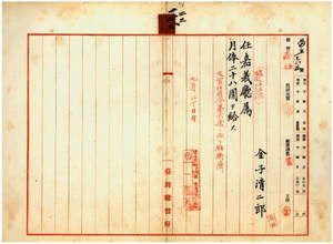 二三 嘉義庁長北原種忠ノ内申ニ依リ台湾総督府雇金子清二郎ヲ文官任用令第六条ニ依リ嘉義庁属ニ任ス[坂田清造の内申書あり]
