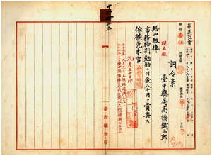 三四 台中庁属高橋鉄三郎ハ脚気ニ罹リ職ニ堪ヘサル旨ヲ以テ辞職願ニ依リ昇級ノ上事務格別勉励ニ付キ一時金ヲ賞与シ本官ヲ免ス