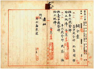 七七 台中庁長佐藤謙太郎ト斗六庁長荒賀直順ノ内申ニ依リ台中庁警部北島国助ヲ斗六庁警部ニ任シ、斗六庁警部武藤猛ヲ台中庁警部ニ任ス