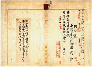 一二 塩水港庁長朝倉菊三郎ノ具申ニ依リ学甲公学校勤務台湾公学校教諭国武源ヲ台湾公学校長ニ兼任シ学甲公学校勤務ヲ命ス