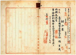 二四 嘉義医院勤務台湾総督府医院書記橘寅蔵ハマラリヤニ罹リ職ニ堪ヘサル旨ヲ以テ辞職願ニ依リ本官ヲ免シ事務格別勉励ニ付キ一時金ヲ賞与ス
