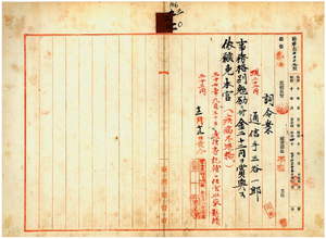 三〇 塩水港郵便局勤務台湾総督府通信手三谷一郎ハ麻拉里亜ニ罹リ職ニ堪ヘサル旨ヲ以テ辞職願ニ依リ事務格別勉励ニ付キ一時金ヲ賞与シ本官ヲ免ス