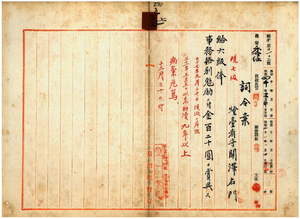 五七 台湾総督府民政部通信局長鹿子木小五郎ノ内申ニ依リ台湾総督府灯台看守関沢右門ハ脚気兼脳溢血ニ罹リ治療中ノ処危篤ニ付キ昇級ノ上事務格別勉励ニ付キ一時金ヲ賞与ス