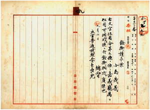 九 嘉義庁長北原種忠ノ内申ニ依リ嘉義庁雇小島茂義ヲ文官任用令第六条ニ基キ嘉義庁属ニ任用スルニ付キ文官普通試験委員長大島久満次ニ銓衡請求ノ件