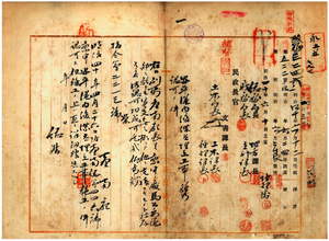 一 台南庁長村上先ノ稟申ニ依リ明治三九年七月ノ暴風雨ニ依リ閉塞シタル安平港内通船不便ノ為メ浚渫並ニ浚渫土砂ヲ以テ埋立工事施行認可及ヒ竣工報告ノ件(指令第二二一三号・第二四〇九号)