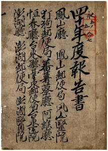 一 明治四〇年度報告書鳳山庁・鳳山郵便局・鳳山医院・打狗郵便局・蕃薯椙庁・阿猴庁・恒春庁・台東庁・台東郵便局・台東医院・澎湖庁・澎湖郵便局・澎湖医院ノ官有財産異動報告ノ件 1907-04-02 1908-11-24・ 鳳山庁官有財産異動報告ノ件 1907-06-27 1908-11-26・─・ 鳳山庁長横山虎次ヨリ稟申(明治四〇年六月二七日)ニ依リ清朝期嘉慶年間ニ建設サレタ鳳山街ヨリ台南ニ通スル道路ニ当ル鳳山城ノ内外二ツノ北門ハ改隷以来荒廃シ当時ノ観ヲ止メスノミナラス毎年ノ暴風雨ノ暴サレ崩壊ノ虞有リ且ツ交通上モ危険ニ付キ取毀ノ上之ニヨリ生スル材料ヲ以テ鳳山市街ヨリ停車場ヘノ新設道路及ヒ下水工事ニ使用致シ度キ件ニ対シ認可ス(指令第二四三七号)[添付 鳳山市北門街門平面図] 1907-06-27 1907-07-16・─・ 鳳山庁長横山虎次ヨリ稟申(明治四〇年八月一〇日付)ノ明治三五年一〇月以降台南陸軍経理部ヨリ機業伝習所家屋トシテ保管転換ヲナシタル鳳山庁大竹里鳳山街草店尾ノ官有家屋ハ仝伝習所廃止シタルニ依リ此度鳳山庁員中有家族者増加ニ伴ヒ庁員官舎ニ充用シタキ件ヲ認可ス(指令第二八六六号) 1907-08-10 1907-08-23・─・ 鳳山庁長横山虎次ヨリ明治四〇年度官有財産異動報告ニ付キ先般提出猶予方照会シタルモ更ニ日延方総務局長事務取扱鹿子木小五郎宛申進ノ件[提出猶予の申進書は・─・にあり] 1908-06-24 1908-06-26・─・ 鳳山庁長横山虎次ヨリ提出サレタ明治四〇年度国庫所属官有建物(官舎六棟及竹柵並ニ建物敷地)異動報告ニ関スル不備ナルモノノ訂正並ニ鳳山庁大竹里鳳山街県口一〇五番符号三官舎弐坪取毀回面総務局長新田新一郎ヘ再提出ノ件 1908-10-07 1908-11-26・─・ 鳳山庁ヘ未提出ノ明治四〇年度官有財産増減異動報告ニ付キ既ニ猶予期限ヲ過ギタルヲ以テ至急提出方催促並ニ提出ニ付キ鳳山庁長横山虎次ヨリ回答ノ件 1908-09-29 1908-10-07・─・ 明治四〇年度官有財産異動報告提出ニ関シ技術者欠員ニ付目下調製中ニ付キ提出猶予方鳳山庁長横山虎次ヨリ申進ノ件 1908-06-11 1908-06-13・ 鳳山郵便局官有財産異動報告ノ件 1908-03-28 1908-08-17・─・ 鳳山郵便局長吉田秀明ヨリ恒春庁宜化恒春街県前街符合七官舎附属厠及同竹垣風雨ノ為メ一月一日ニ倒壊シタルニ付キ報告ノ件 1908-03-28 1908-04-17・─・ 鳳山郵便局長吉田秀明ヨリ同上建物及附属物倒壊報告ノ件 1908-06-04 1908-06-06・─・ 鳳山郵便局長吉田秀明ヨリ報告サレタ恒春庁宜化里恒春県前街ノ石及煉瓦土塊造平家台湾瓦葺恒春郵便局庁舎模様替修繕ニ伴フ建坪減少ニ付キ図面添付之ナキ為メ再度図面提出方同局長ヘ照会ノ件 1908-08-15 1908-08-17・─・ 鳳山郵便局長吉田秀明ヨリ恒春庁宜化里恒春県前街恒春郵便局庁舎(石及煉瓦骨土塊造平家台湾瓦葺)及阿猴庁港西上里阿里港街阿里港郵便出張所事務所(土塊造平家台湾小屋瓦葺)ノ各室内床コンクリート叩壁積替ニ付キ窓変公衆扣所模様替及屋根葺替事務室ノ一部ニ二回張及床煉瓦敷トス為メニ付キ官有建物変更報告ノ件[添付 恒春郵便局庁舎模様図面・阿里港郵便出張所模様替図面] 1908-04-28 1908-04-30・ 鳳山医院官有財産異動報告ノ件 1908-04-30 1908-05-04・ 打狗郵便局官有財産異動報告ノ件 1907-05-07 1908-06-06・─・ 打狗郵便局長永井元男ヨリ提出ノ明治四〇年度船舶及附属物増減異動(鳳山庁打狗港定繋支那形艀船ノ錨三個新調)報告ノ件 1907-05-07 1907-05-21・─・ 打狗郵便局長永井元男ヨリ申請(打庶第七七七号ノ二)サレタル蕃薯椙庁羅漢外内里蕃薯椙街借地四三二ノ蕃薯椙郵便局集配人宿舎(竹造リ掛ケ下シ萱葺)ハ虫害並ニ腐蝕ヲ来シ土塊剥落亀裂ヲ生シ危険尠カラス処先般五・六月ノ強雨ノ為メ大破シ全部ノ修繕ヲ要セルモ其ノ価値少キニ付キ棄却スルヲ至当ト判断シタルニ依リ棄却ノ件ヲ認可ス(指令第三二〇八号・民総第六六六〇号) 1907-08-31 1907-09-21・─・ 蕃薯椙郵便局集配人宿舎取毀ノ儀未タ総督ノ認可ヲ受ケサル前ニ取毀報告書提出サレタルハ不穏当ニ付キ追認方打狗郵便局ヘ照会(総地理第一〇六九号)再申請(打庶第七七七号ノ二)ノ件 1907-08-28 1907-10-09・─・ 打狗郵便局長永井元男ヨリ打狗郵便局庁舎各所修繕工事ノ結果ニ付キ報告ノ件(打庶第一〇八七号ノ二) 1908-01-15 1908-02-13・─・ 打狗郵便局長永井元男ヨリ提出サレタ鳳山庁興隆内哨船頭街建一九番地ノ打狗郵便局官舎修繕ニ依ル官有財産異動報告ノ件(打庶第一七七号)[・─・も見よ] 1908-02-27 1908-04-06・─・ 打狗郵便局長永井元男ヨリ提出サレタ鳳山庁興隆内里哨船頭街二五番地打狗郵便局庁舎事務室及為替室板張ヲ煉瓦敷ニ変更ニ付キ官有財産異動報告ノ件(打庶第一〇八七号ノ一) 1907-12-02 1907-12-12・─・ 打狗郵便局長永井元男ヨリ鳳山庁興隆内里哨船頭街建一九番地打狗郵便局官舎建物ハ明治三七年月日不詳ニテ土木局ニ於テ内部改修アリタルガ官有財産異動報告未済ノ件発顕シタル為メ報告ノ件 1908-03-05 1908-04-01・─・ 打狗郵便局長永井元男ヨリ提出サレタ鳳山庁興隆内里哨船頭街二五番地打狗郵便局庁舎土塊造明治四〇年一二月二日打庶第一〇八七号ノ一及同四一年一月一五日打庶第一〇八七号