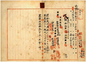 一一 罰金受刑者死亡シタルトキハ罰金ハ遺産ヨリ徴収スヘキヤ否ヤニ関スル照会ニ対シ覆審法院検察官長尾立維孝ヨリ回答ノ件