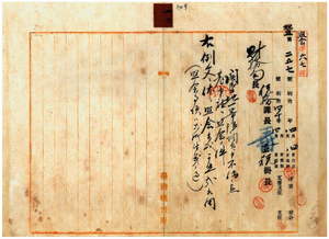 一〇 台中庁長佐藤謙太郎ヨリ稟申ノ台中庁管内ニ於ケル林登玉ノ藍興堡五張犁庄ノ田、林隆・林木・林聘・林大海ノ同堡詹園庄ノ田、林連草ノ同堡草湖庄ノ田、林丕謨・林高興ノ同堡同庄ノ田、林祥山ノ同堡塗城庄ノ田、楊勇ノ同堡三錫庄ノ畑、廖金水・林蔵月ノ同堡同庄ノ畑、林万彩ノ同堡同庄ノ畑、林万億ノ同堡同庄ノ畑、王添地ノ同堡同庄ノ畑、林墩ノ同堡同庄ノ畑、廖源良ノ同堡同庄ノ畑、呉添ノ同堡同庄ノ畑、陳金釵・陳老送・陳振昌ノ師東上堡下渓洲庄土名後壁厝ノ田、楊清波・楊渓・楊登・楊火戊ノ同堡同庄土名後リョノ畑、頼朝芳ノ師東下堡軍功リ(1907-03-30~1907-05-06);台中庁長佐藤謙太郎ヨリ稟申ノ明治四〇年三月三〇日付中税発第三〇六号ヲ以テ開墾地業主権認定方稟申書中附属開墾地一筆限調書中ノ猫羅堡同安厝庄ニ係ル地番誤記訂正方ニ付キ認可ノ件(指令第二五五〇号)(1908-07-01~1908-07-11)