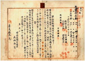 一五 嘉義庁長北原種忠ノ申請ニ依リ学祖財団所属地嘉義西堡嘉義街土名西門外ノ畑及ヒ嘉義西堡下路頭庄ノ田ヲ嘉義駅機関庫給水用トシテ八掌渓嘉義駅間ニ引用水鉄管布設工事ニ使用並ニ同鉄管布設ノ無償無期限使用ノ儀ニ付キ承認ノ件(契約書は業主学租財団管理者民政長官大島久満次代理嘉義庁長北原種忠・使用者鉄道部長代理新元鹿之助)