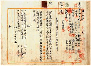 四 逓信省ヨリ送付セラレタル五円及ヒ拾円切手見本二種ヲ掲示並ニ見本貼付用トシテ台北・台南・基隆・台中・宜蘭・淡水・新竹・苗栗・彰化・斗六・嘉義・塩水港・打狗、鳳山・澎湖・台東ノ各郵便局ヘ配布ノ件