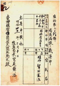 二九 台湾総督府民政部殖産局長宮尾舜治ノ具申ニ依リ台湾総督府技師賀田直治ヲ林野業務監査ノ為メ嘉義・斗六ノ両庁管内ヘ出張ヲ命ス