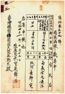 三二 台湾総督府民政部殖産局長宮尾舜治ノ具申ニ依リ台湾総督府民政部殖産局長宮尾舜治ヲ殖産事務巡閲ノ為メ、台湾総督府技師東郷実ヲ農政上取調ノ為メ、各々嘉義・塩水港・台南・蕃薯リョ・鳳山・阿緱ノ各庁管内ヘ出張ヲ命ス