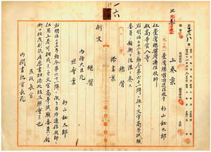 一六 台湾総督府民政部通信局長鹿子木小五郎ノ内申ニ依リ台湾総督府通信技手杉山鈺太郎ヲ台湾総督府通信技師ニ任シ台北郵便局建築課長ヲ命ス[一八に銓衡結果認定書あり]