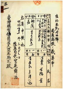 三一 台湾総督府民政部殖産局長官宮尾舜治ノ具申ニ依リ移出米検査員協議会出席及ヒ産業状況視察ノ為メ事務官古橋直ニ新竹・台中・彰化各庁管内ヘノ出張ヲ命シ(三月二〇日付)
