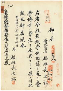 九 台湾総督府医院医長稲垣長次郎ヨリ同人医学博士ノ学位ヲ授与セラレタルニ依リ届出ノ件