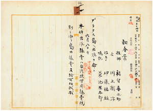 一一 台湾総督府民政部殖産局長宮尾舜治ノ具申ニ依リ台湾総督府技師福留喜之助ニ鉱物調査ノ為メ、台湾総督府技師川上瀧弥ニ植物調査ノ為メ、台湾総督府技手伊藤祐雄ニ水産物調査ノ為メ、台湾総督府嘱託菊池米太郎ニ博物標本採収ノ為メプラタス島ヘノ出張ヲ命ス
