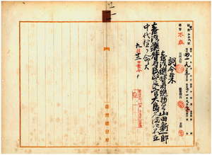 一一 台湾総督府民政部総務局長山田新一郎ニ台湾総督府民政長官大島久満次不在中ノ代理ヲ命ス
