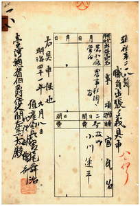 一八 台湾総督府民政部殖産局長代理峡謙斉ノ具申ニ依リ台湾総督府技師小川運平ニ農事取調ノ為メ台北庁管内ヘ出張ヲ命ス