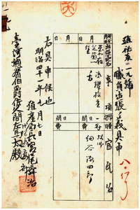 一九 台北庁長加藤尚志ノ派遣申請ニ付キ台湾総督府民政部殖産局長代理峡謙斉ノ具申ニ依リ台湾総督府技師細谷源四郎ニ汽鑵検査ノ為メ台北庁芝蘭一堡ヘ出張ヲ命ス