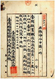 三四 台北監獄長台湾総督府典獄志豆機源太郎ニ台湾縦貫鉄道全通式委員トシテ台中駅ニ於テ貴賓送迎係担任ノ為メ台中庁ヘ出張ノ旨台北監獄長台湾総督府典獄志豆機源太郎ヨリ稟申ノ件