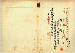 二〇 台湾総督府覆審法院検察官長代理西内金吾ノ上申ニ依リ台北地方法院新竹出張所詰台湾総督府法院検察官土屋達太郎ニ台北地方法院兼務ヲ命ス