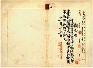 二九 台北医院長医学博士長野純蔵ノ内申ニ依リ台湾総督府医院医長稲垣長次郎ニ台北医院長長野純蔵不在中ノ代理ヲ命ス