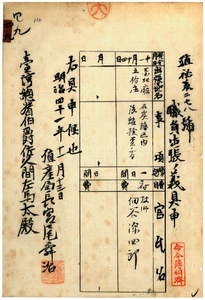 四九 台北庁長加藤尚志ヨリ基隆庁石碇堡長坑土名渓洲リョ庄ノ伊勢田兵次郎ヨリ石炭坑排水用トシテ同庁下芝蘭一堡伍份庄土名内溝ニ蒸汽々鑵据付ヲ出願セシメタルニ依リ検査ノ為メ九月一〇日ニ台湾総督府技師細谷源四郎ヲ派遣シタルモ関係者不在ノ為メ検査出来ズ再度派遣方申請ヲナシ来リタルニ付キ台湾総督府民政部殖産局長宮尾舜治ノ具申ニ依リ技師細谷源四郎ニ石炭鉱区内汽罐検査ノ為メ台北庁五份庄ヘ出張ヲ命ス