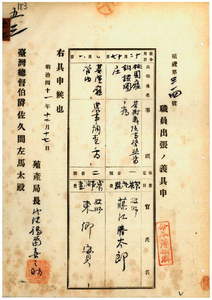 五三 台湾総督府民政部殖産局長代理福留喜之助ノ具申ニ依リ茶樹栽培事務監督ノ為メ台湾総督府技師藤江勝太郎ヘ桃園庁銅鑼圏庄ヘ出張ヲ命シ、農事調査ノ為メ台湾総督府技師東郷実ニ基隆庁管内ヘ出張ヲ命ス