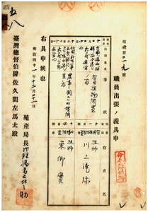 五八 台湾総督府民政部殖産局長代理福留喜之助ノ具申ニ依リ有用植物調査ノ為メ台湾総督府技師川上滝弥ヘ台南・鳳山・阿緱・塩水港・嘉義庁管内ヘ出張ヲ命シ、農事ニ関スル旧慣調査ノ為メ台湾総督府技師東郷実ヘ桃園・新竹・台中・苗栗・彰化・斗六・塩水港・嘉義・台南ノ各庁管内ヘ出張ヲ命ス