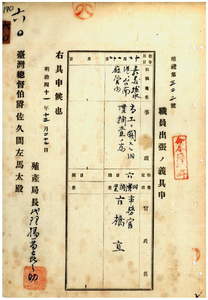 六〇 台湾総督府民政部殖産局長代理福留喜之助ノ具申ニ依リ商工ニ関スル旧慣調査ノ為メ台湾総督府事務官古橋直ヘ嘉義・塩水港・台南ノ各庁管内ヘ出張ヲ命ス