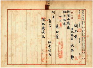 一一 鳳山庁長横山虎次ト深坑庁長丹野英清ノ内申ニ依リ深坑庁属大西静ヲ鳳山庁属ニ任ス