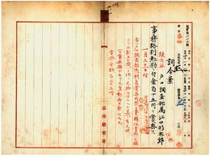 六一 臨時総督府台湾戸口調査部長祝辰巳ノ内申ニ依リ臨時台湾戸口調査部属江口形太郎ニ事務格別勉励ニ付キ一時金ヲ賞与ス