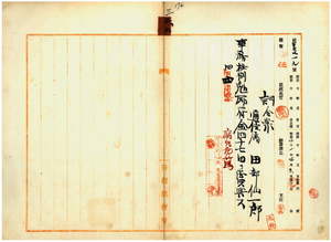 三六 台湾総督府民政部通信局長鹿子木小五郎ノ内申ニ依リ台南郵便局勤務台湾総督府通信属田部仙一郎ハ病気危篤ノ為メ事務格別勉励ニ付キ一時金ヲ賞与ス