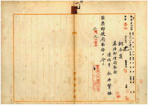 一九 苗栗郵便局長杉本初吉ノ内申ニ依リ基隆郵便局勤務台湾総督府通信手永井賢助ニ苗栗郵便局勤務ヲ命ス