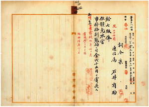 二四 台中郵便局勤務台湾総督府通信属石井有助ハ疾病ニ罹リ職ニ堪ヘサル旨ヲ以テ辞職願ニ依リ昇級ノ上本官ヲ免シ事務格別勉励ニ付キ一時金ヲ賞与ス
