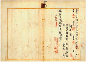 二八 台北庁長加藤尚志ノ照会ニ依リ台湾総督府国語学校教諭ノ加藤春城ト鷲野昇ニ崔崢公学校教諭事務取扱ヲ命ス