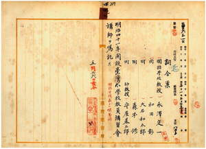 四七 台湾総督府民政部総務局長代理宮尾舜治ノ内申ニ依リ台湾総督府国語学校教授ノ永沢定一・和田彰・大石和太郎・森本修ト台湾総督府国語学校助教授守屋基三郎ニ明治四一年開設台湾小学校教員講習会講師ヲ嘱託ス