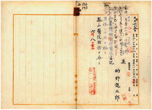二四 鳳山医院長事務取扱芳沢鷹之助ノ内申ニ依リ台湾総督府雇的野龍太郎ヲ台湾総督府医院書記ニ任シ鳳山医院勤務ヲ命ス