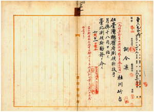 三一 台湾総督府民政部通信局長鹿子木小五郎ノ内申ニ依リ元岐阜県高山測候所技手桂川竹吉ヲ台湾総督府測候所技手ニ任シ台北測候所勤務ヲ命ス