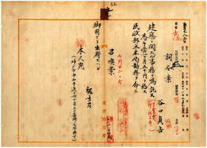 九 台湾総督府民政部土木局長心得長尾半平ノ内申ニ依リ神戸市在住ノ谷口貞吉ニ建築ニ関スル事務ヲ嘱託シ台湾総督府民政部土木局勤務ヲ命シ出府ヲ命ス