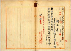 一八 蕃薯リョ庁長石橋亨ノ内申ニ依リ蕃薯リョ公学校勤務台湾公学校教諭宮崎貞二郎ヲ台湾小学校教諭ニ兼任シ台南尋常高等小学校本科正教員ヲ命ス