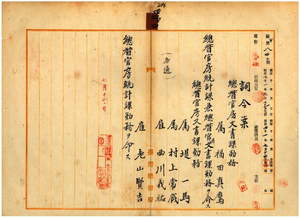 四四 台湾総督官房文書課長斎藤参吉ノ内申ニ依リ台湾総督官房文書課勤務台湾総督府属福田真鷹ニ台湾総督官房統計課兼総督官房文書課勤務ヲ命シ、台湾総督官房文書課勤務台湾総督府属ノ堤一馬・村上常蔵、台湾総督府雇ノ西川義祐・老山賢吉ニ台湾総督官房統計課勤務ヲ命ス