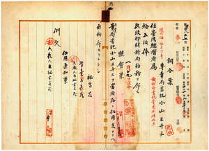 二 台湾総督府民政部財務局長代理峡謙斉ノ内申ニ依リ大蔵省専売局熊本収納所東大分出張所長専売局書記小山三千三ヲ台湾総督府属ニ任シ台湾総督府民政部財務局勤務ヲ命ス