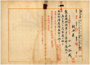 一五 台湾総督府民政部殖産局長代理峡謙斉ノ具申ニ依リ東京専門学校英政科卒業小山谷蔵ニ現住地米国紐育市ニテ製茶販路調査ニ関スル事務ヲ嘱託シ台湾総督府民政部殖産局勤務ヲ命ス