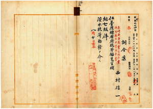 二三 淡水税関長岩政憲三ノ内申ニ依リ長崎高等商業学校卒業西村信一ヲ台湾総督府税関鑑定官補ニ任シ淡水税関勤務ヲ命ス
