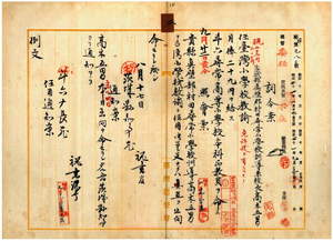 二 斗六庁長山口利文ノ内申ニ依リ茨城県真壁郡村田尋常小学校訓導兼校長高木五男ヲ台湾小学校教諭ニ任シ斗六尋常高等小学校本科正教員ヲ命ス