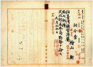 三三 台湾総督府民政部土木局長心得長尾半平ノ内申ニ依リ台湾総督府雇檜山衛ヲ御用済解雇シタ上デ文官任用令第六条ニ依リ台湾総督府属ニ任シ台湾総督府民政部土木局勤務ヲ命ス