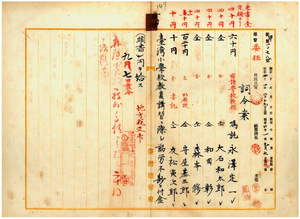 三四 台湾総督府民政部総務局長代理大島久満次ノ内申ニ依リ本年度台湾小学校教員講習ニ際シ勤労尠カラサルニ付キ講師ヲ嘱託シタル国語学校教授ノ永沢定一・大石和太郎・和田彰・森本修及ヒ国語学校助教授守屋基三郎並ニ国語学校書記友松寅次郎ヘ手当金ヲ給ス(註) 本案件の参照資料として添付された文書として、永沢以下各員の従事時間数メモと台湾小学校及公学校教員講習会賞与調(明治三八年九月)、台湾公学校及公学校教員講習会賞与調(明治三七年三月六日)、統計講習会賞与調(明治三七年三月)、統計講習会賞与調(明治三八年一一月)、統計講習会賞与調(明治三九年八月)、第五回内国勧業博覧会委員賞与調(明治三五年四月)、台北市街給水調査会賞与調(明治四〇年六月)、衛生事務講習会賞与(明治三七年三月)が綴られている。