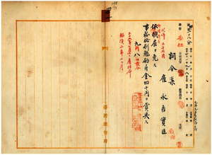 四一 台湾総督府民政部殖産局長代理峡謙斉ノ具申ニ依リ台湾総督府雇永吉実臣ヲ御用済ニ付キ雇ヲ免シ事務格別勉励ニ付キ一時金ヲ賞与ス[四〇の註も見よ]