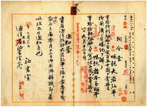 四八 大阪府下富田林ニ於ケル台湾総督府電柱丹礬注入工事結了ニ付キ台湾総督府民政部通信局長代理井村大吉ノ内申ニ依リ電柱丹礬注入工事ニ関スル事務嘱託逓信省通信技師大岩弘平ニ事務格別勉励ニ付キ一時金ヲ賞与シ御用済ニ付キ嘱託ヲ解キ、電柱丹礬注入工事ニ関スル事務嘱託大阪郵便局勤務逓信省通信属岩本喜輪平ニ事務格別勉励ニ付キ一時金ヲ賞与ス